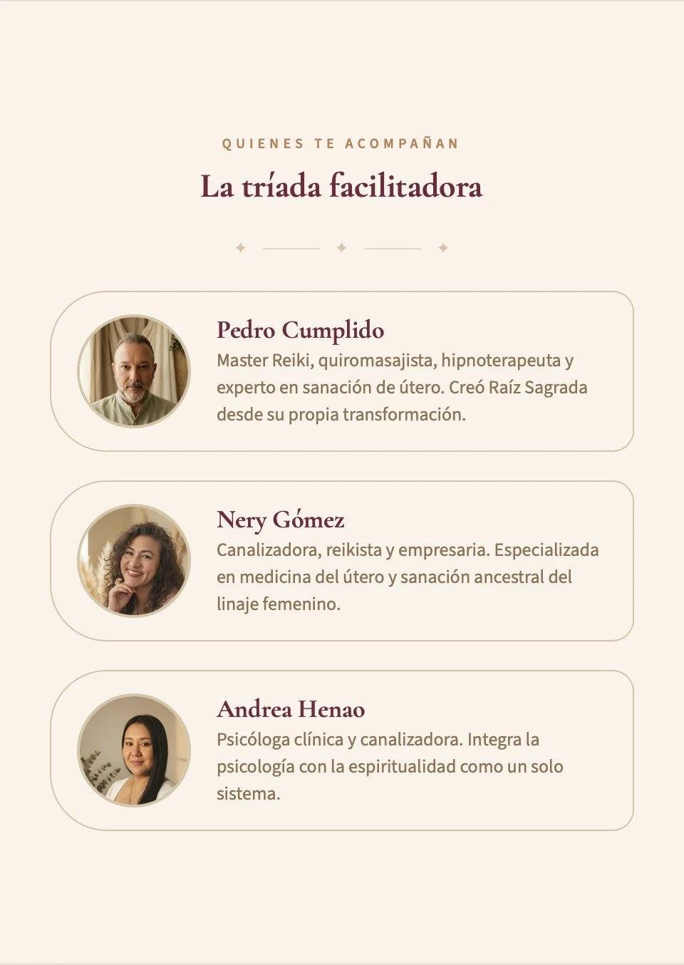 Este espacio está guiado por facilitadores que acompañan desde la experiencia, la sensibilidad y una profunda vocación de servicio: