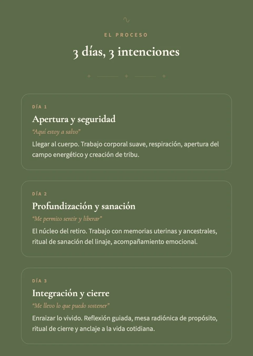 Durante estos tres días, se tejerá un camino de sanación que une cuerpo, mente y espíritu: psicología, trabajo somático, energía y memorias ancestrales se entrelazan para acompañar un regreso a la esencia, a la raíz, a lo que verdaderamente somos.